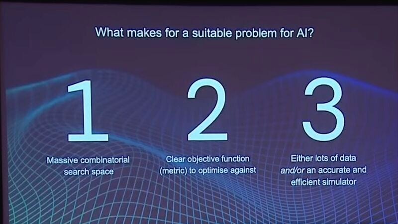 Demis Hassabis partage dans son discours 3 critères clés pour définir un "bon problème à résoudre" par l’IA (entendre : un problème pour lequel nous ou d’autres allons utiliser l'IA pour renverser la table) :